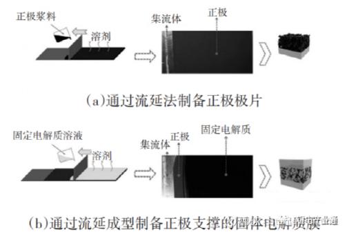 湿法工艺操作简单,工艺成熟,易于规模化生产,但成本高,且采用的溶剂可能具有毒性,残留的溶剂会降低固体电解质膜的离子电导率。按照载体不同,湿法工艺可分为模具支撑成膜、正极支撑成膜以及骨架支撑成膜。模具支撑成膜常被用于制备聚合物电解质膜及复合电解质膜,将固体电解质溶液倾倒在模具上,随后蒸发溶剂,从而获得固体电解质膜,通过调节溶液的体积和浓度来控制膜的厚度。正极支撑成膜常用于无机电解质膜及复合电解质膜的制备,将固体电解质溶液直接浇在正极表面,蒸发掉溶剂后,在正极表面形成固体电解质膜。与模具支撑相比,正极支撑可以获得更薄的固体电解质膜和更好的界面接触。骨架支撑成膜常用于复合电解质膜的制备,将固体电解质溶液注入骨架中,蒸发掉溶剂后,形成具有骨架支撑的固体电解质膜。