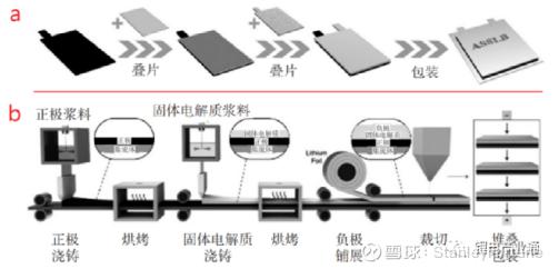 一体化叠片(图b)是在裁切前将正极,固体电解质膜和负极压延成3层结构,按尺寸需求将该3层结构裁切成多个"正极-固体电解质膜-负极"单元,并将其堆叠在一起后进行包装。